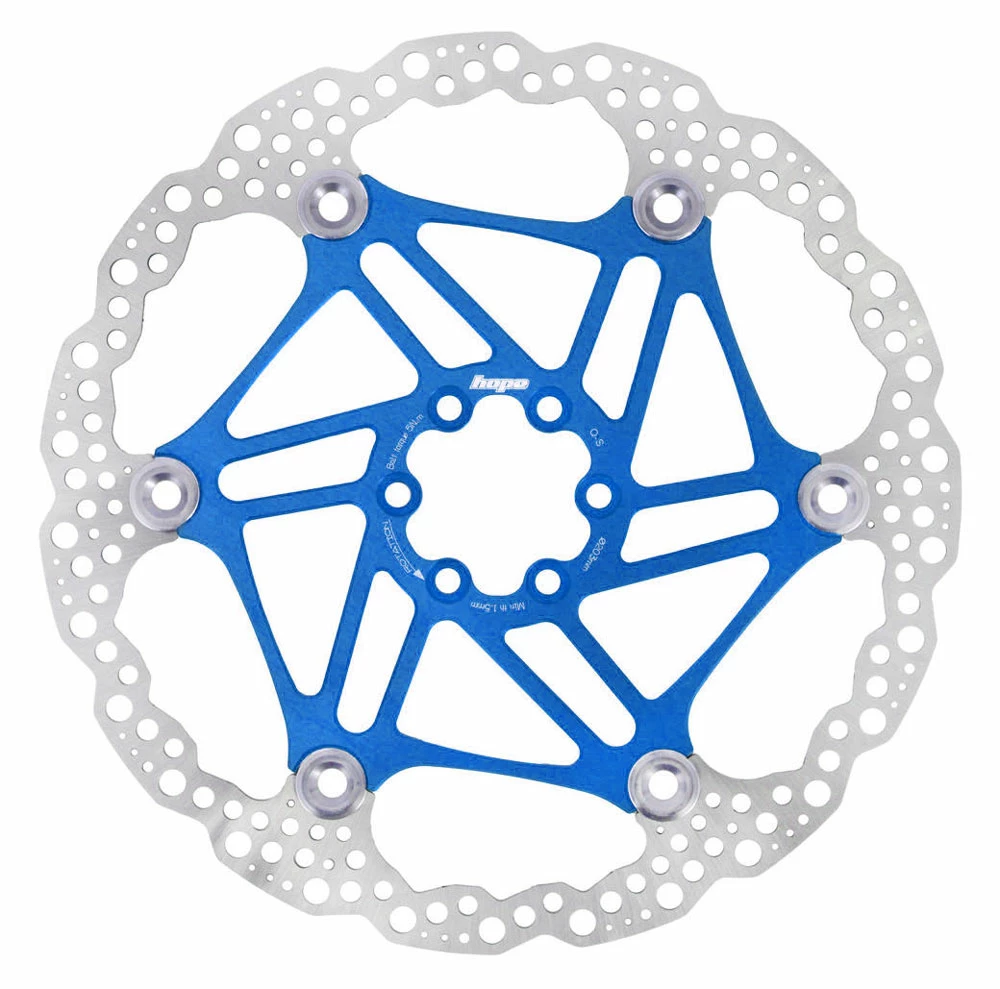 Hope’s Floating 6-Loch Scheibenbremsen sind unter Mountainbiker beliebt, da sie die Leistung optimieren und einfach auffallend sind. Die Bremsfläche aus Edelstahl wird zum Aluträger genietet. Diese Konstruktion spart Gewicht und die Scheibe darf sich bei Wärme ausdehnen und zusammenziehen, ohne verformt zu werden.